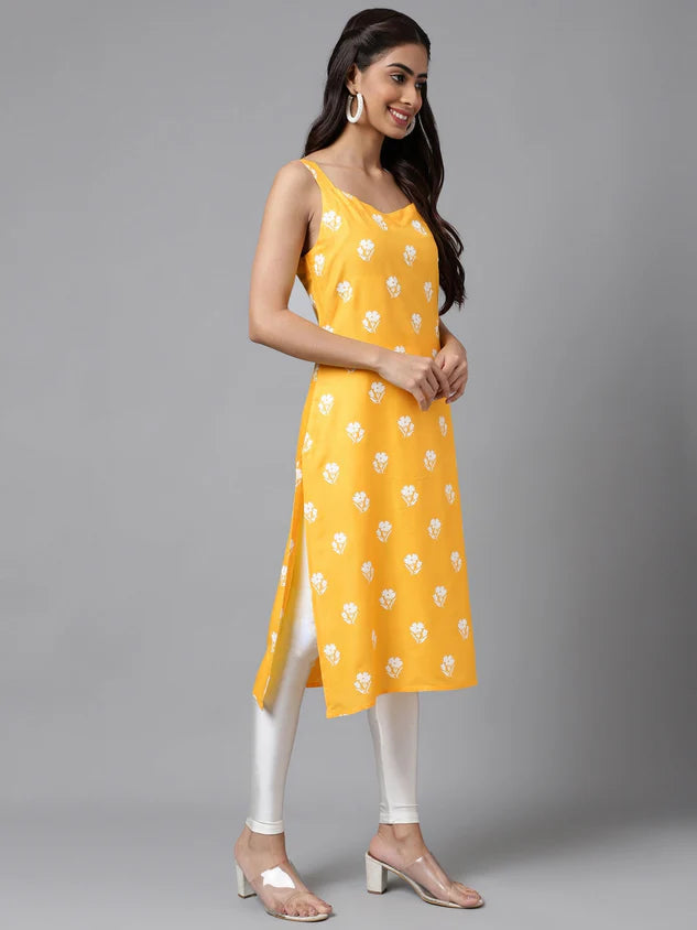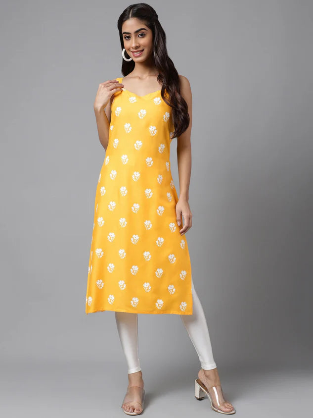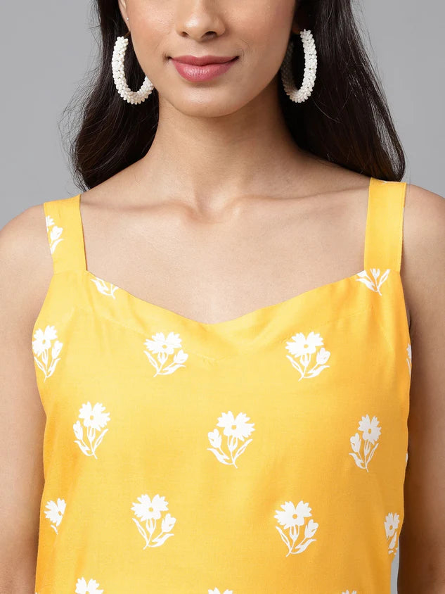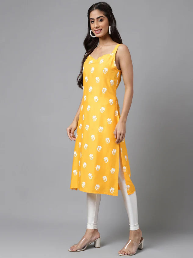 Embrace a sweet and summery vibe with our Mustard Cotton Floral Print Dress. This charming calf-length dress showcases a delightful floral print, radiating freshness and style. Its sleeveless design and sweetheart neckline infuse a feminine allure, while the straight silhouette promises comfort throughout the day. Adding a trendy edge, the strap sleeves elevate its appeal. Easy to maintain, simply hand wash to keep it looking fresh and vibrant. Whether it's a brunch date or a casual outing with friends, this dress is your go-to choice for a relaxed yet chic ensemble.